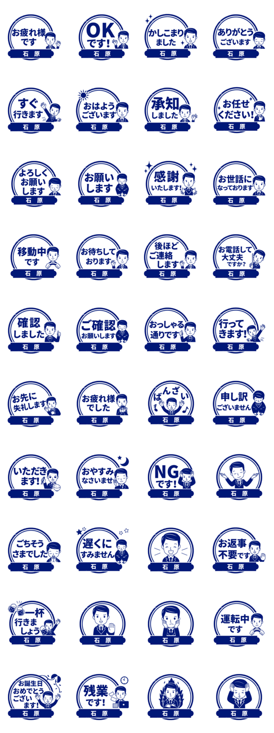 | スタンプ説明 | 石原/いしはら様専用!ビジネスマン、サラリーマンの会社仕事にOK!職場、オフィス業務他、大人のマナー丁寧敬語でもOK。印鑑/はんこ/ハンコ/判子/名字/名前入り/スタンプ |