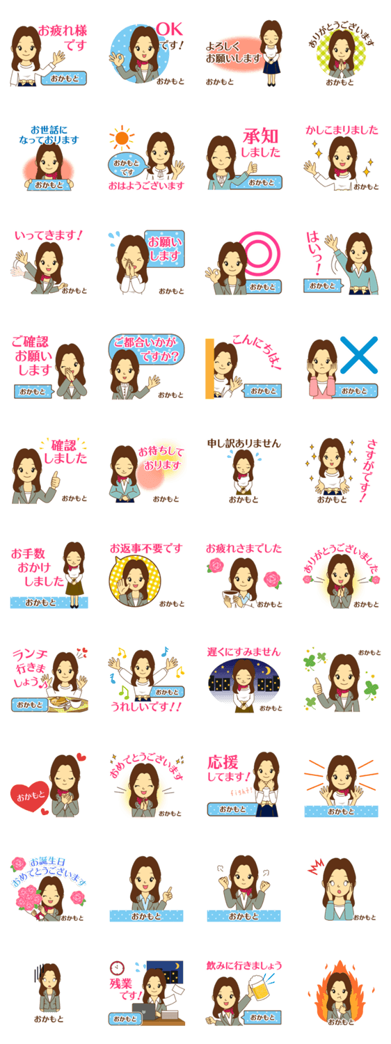 | スタンプ説明 | 仕事や社会人や大人の丁寧な敬語に♪会社/女性/パート/OL/アイシス作[岡本/おかもと/オカモト/丘元/丘本/岡元/岡基/岡源/岳元/岳本/陵本]おなまえ/名字/苗字/女/デザイン |