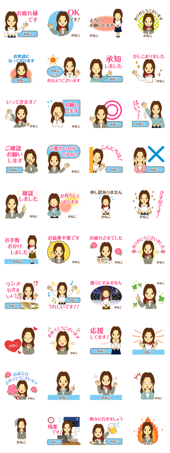 | スタンプ説明 | 仕事や社会人や大人の丁寧な敬語に♪会社/女性/パート/OL/アイシス作[金子/かねこ/カネコ/兼子/周子/兼古/金児/金古/鐘子/鉦子/金戸/兼戸/兼児]おなまえ/名字/苗字/女 |