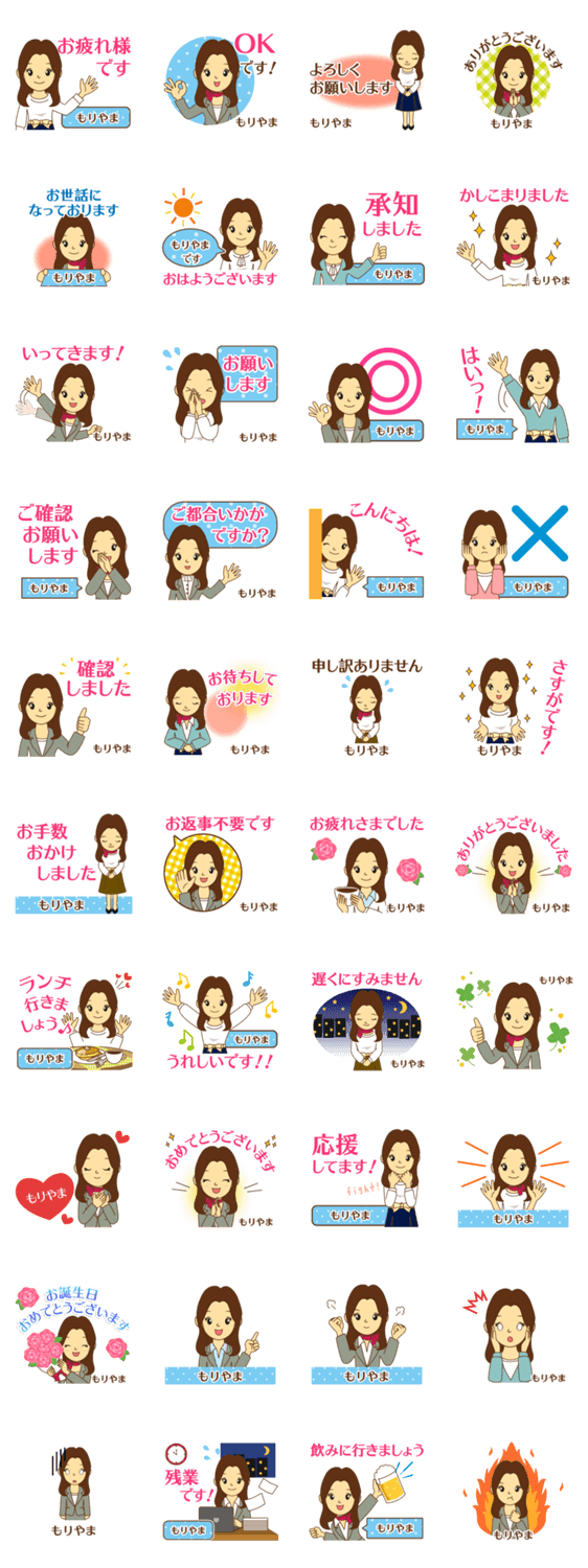 | スタンプ説明 | 大人や社会人の丁寧な敬語や仕事にも◆会社,女性,パート,OL,アイシス作[森山/もりやま/モリヤマ/守山/杜山/毛利山/盛山/護山]おなまえ/名字/苗字/女/デザイン/専用/お名前 |