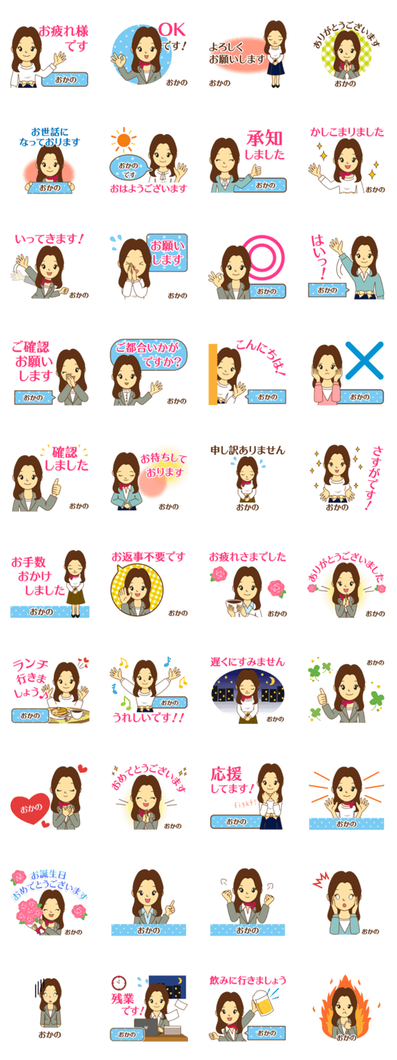 | スタンプ説明 | 大人や社会人の丁寧な敬語や仕事にも◆会社,女性,パート,OL,アイシス作[岡野/おかの/オカノ/丘野/小神埜/小神野/小鹿野/岡乃/岡埜]おなまえ/名字/苗字/女/デザイン/専用 |