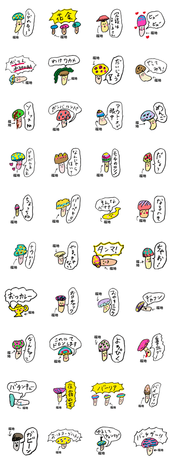 福地専用死語スタンプ。カラフルきのこがゆるーく懐かしの昭和の流行語を話すよ。