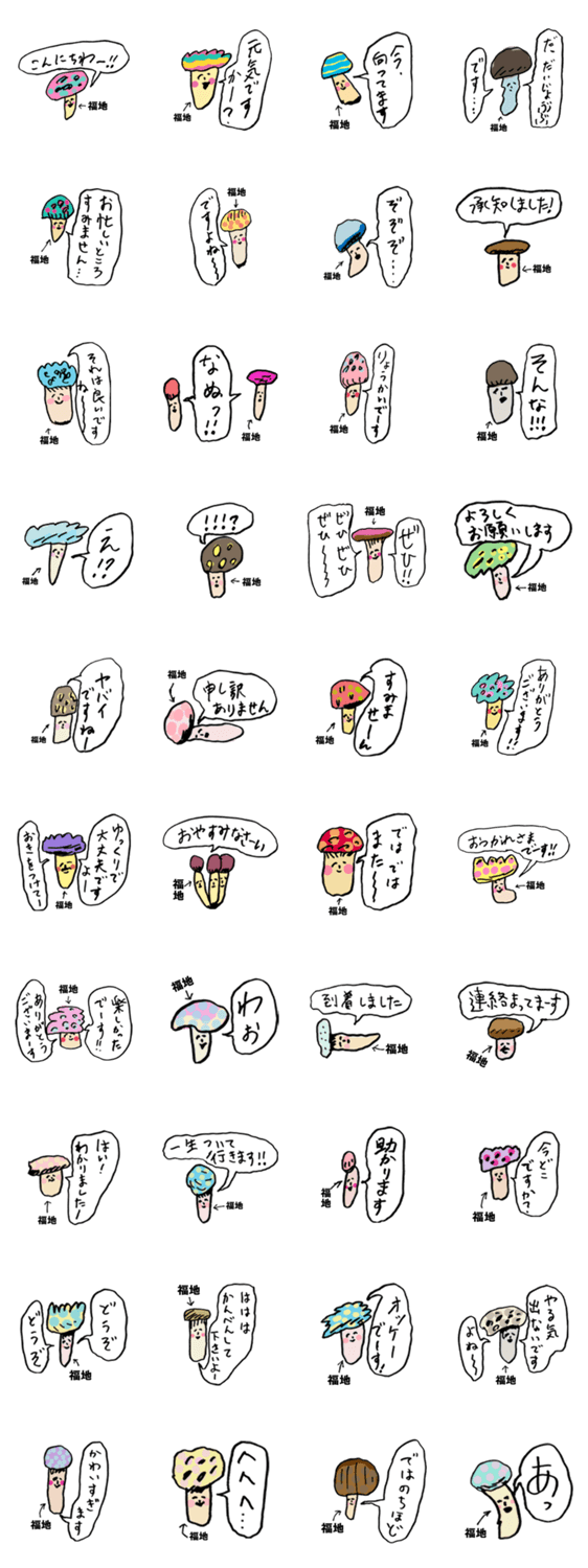 福地専用敬語丁寧語スタンプ。カラフルきのこがゆるーく敬語丁寧語を話すよ。