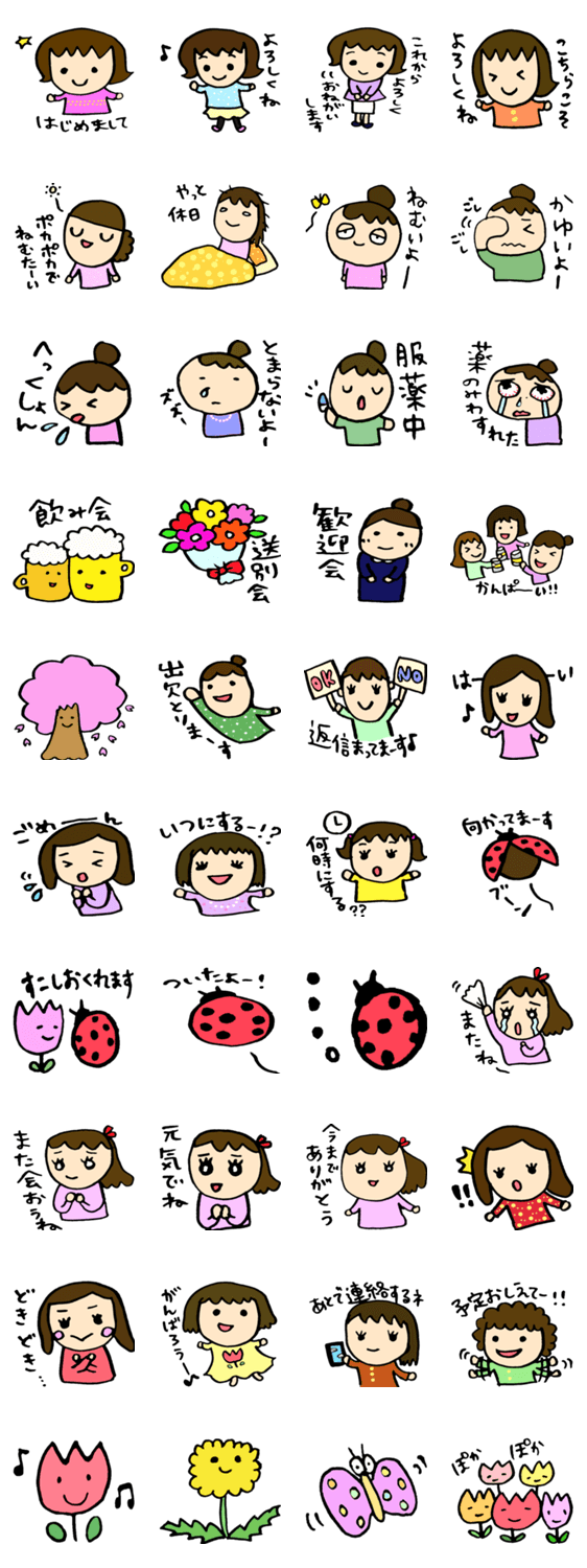 別れ、出会い、飲み会、花粉症。お花やてんとう虫も。春に使えるスタンプです。