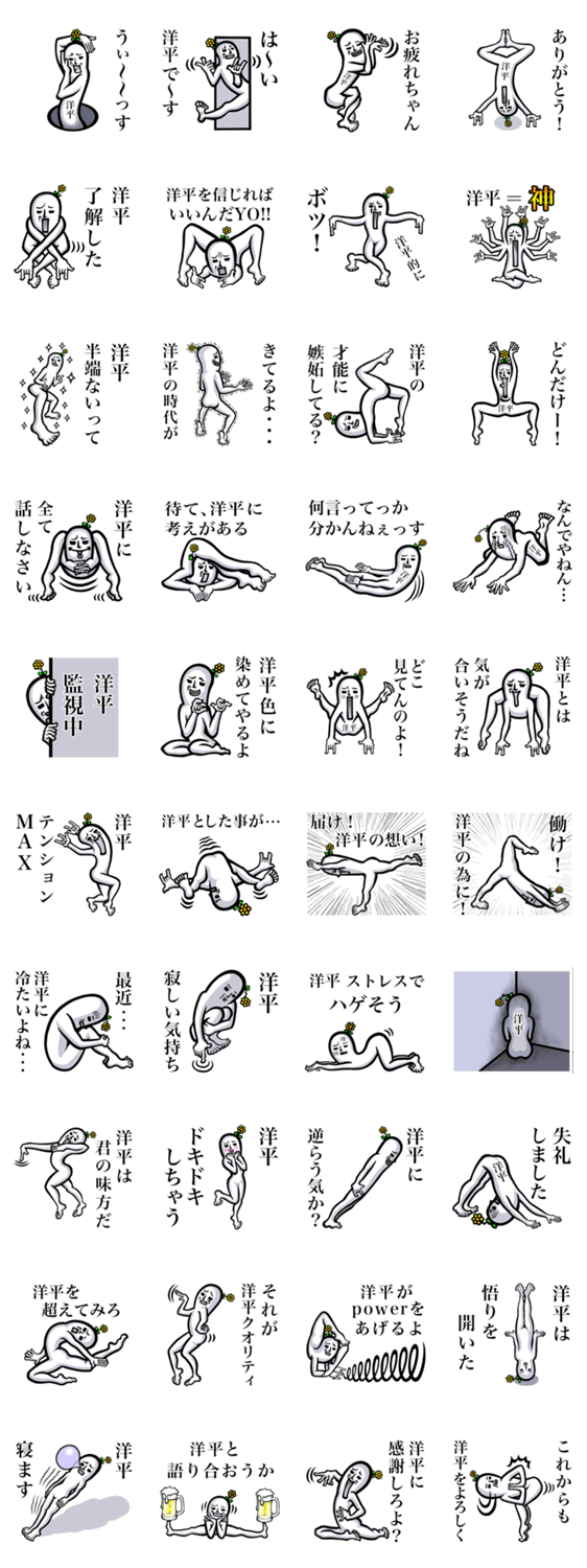 | スタンプ説明 | 名前が【洋平】スタンプ。洋平/ようへい/ヨウヘイ/ようちゃん/ヨウチャン/洋平君/ようくん/ヨウクン/ようっち/ヨウッチ/ようりん/ヨウリン/よーるん/ヨールン/なぽぴらふ |
