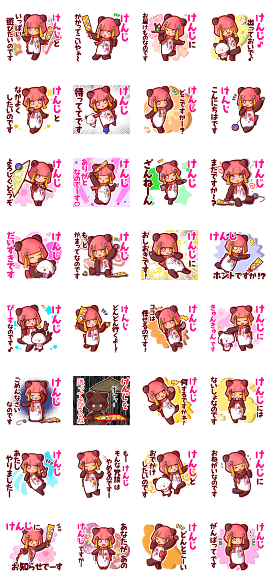 | スタンプ説明 | ゆっけ。が贈る【けんじ】に『送る用』名前スタンプ32です。友達や恋人とのやりとりにぜひ。《きぐるみじょし》05「パンダなわらしちゃん」と親友の「甘パン」です。 |