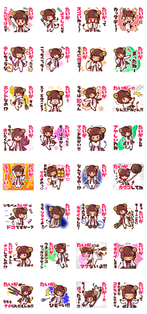 | スタンプ説明 | ゆっけ。が贈る【たいが】に『送る用』名前スタンプ29です。友達や恋人とのやりとりに。《きぐるみじょし》03「デビルなしーちゃん」です。 |