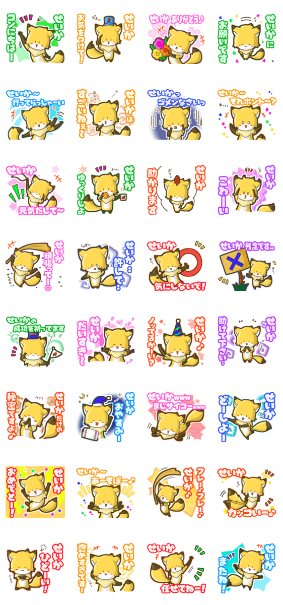 | スタンプ説明 | ゆっけ。が贈る【せいか】に『送る用』名前スタンプ18です。友達や恋人とのやりとりに。《ゆっけ。のアニぱ!》02「おちゃめなきつねっこ」です。 |