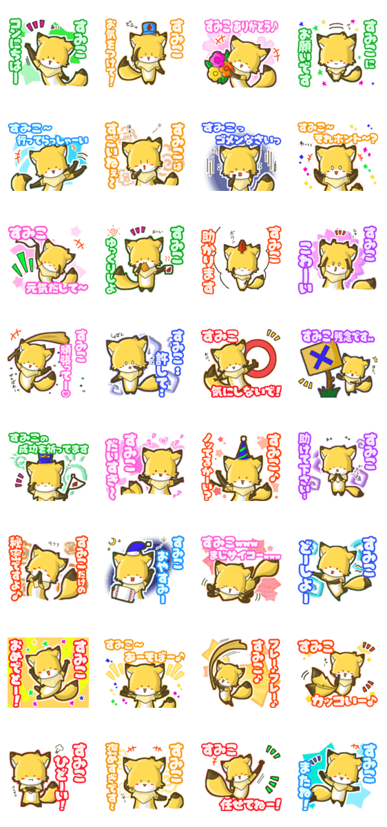 | スタンプ説明 | ゆっけ。が贈る【すみこ】に『送る用』名前スタンプ18です。友達や恋人とのやりとりに。《ゆっけ。のアニぱ!》02「おちゃめなきつねっこ」です。 |