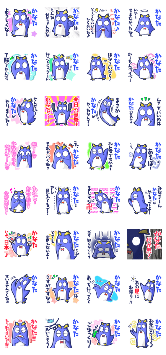 | スタンプ説明 | ゆっけ。が贈る【かなた】に『送る用』名前スタンプ21です。友達や恋人とのやりとりに。《ゆっけ。のアニぱ!》05「てきとーなペンギン」です。 |