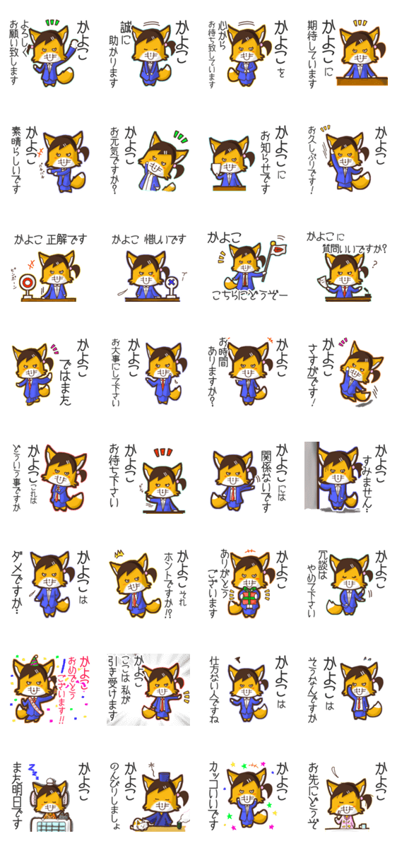 | スタンプ説明 | ゆっけ。が贈る【かよこ】に『送る用』名前スタンプ23です。友達とのやりとり等に。《ゆっけ。のアニぱ!》07「きつねのてんくー姉妹・妹くーこ」です。 |