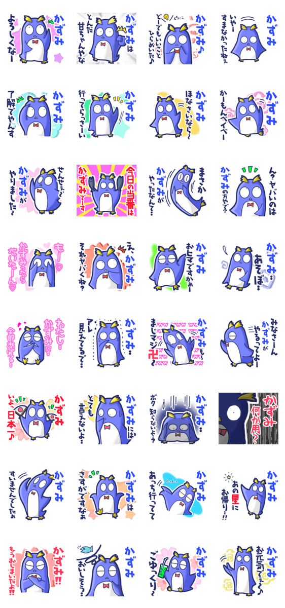 | スタンプ説明 | ゆっけ。が贈る【かずみ】に『送る用』名前スタンプ21です。友達や恋人とのやりとりに。《ゆっけ。のアニぱ!》05「てきとーなペンギン」です。 |