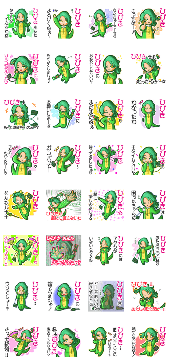 | スタンプ説明 | ゆっけ。が贈る【ひびき】に『送る用』名前スタンプ31です。友達や恋人とのやりとりに。《きぐるみじょし》04「バブルなヘビねーさん」です。 |