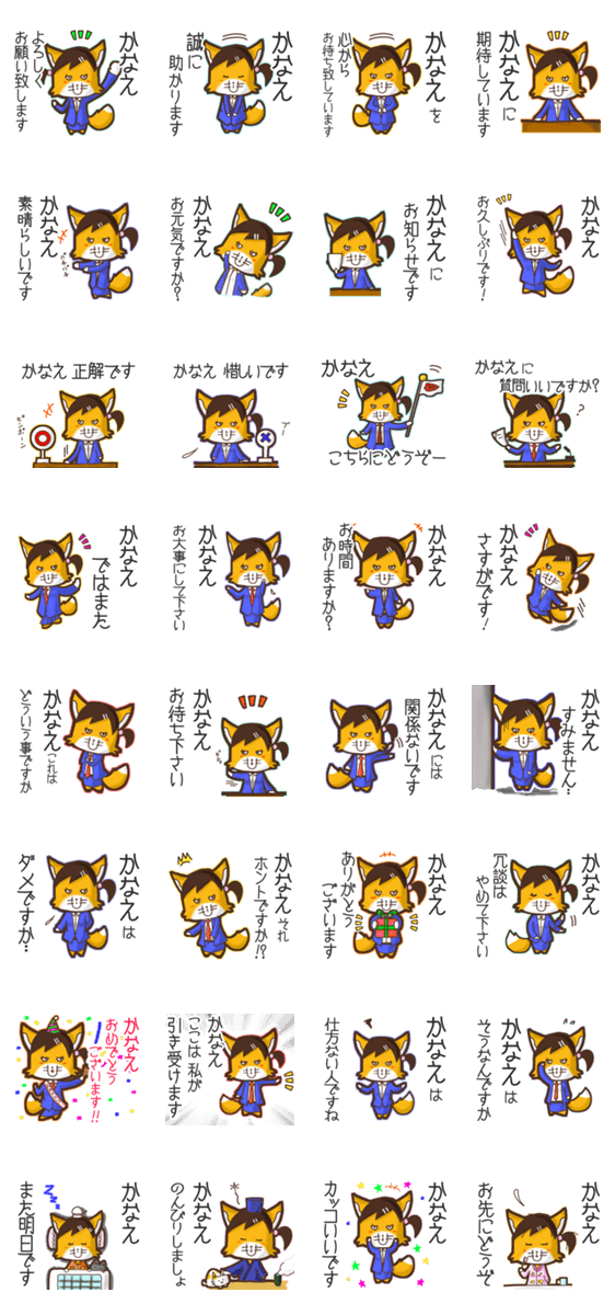 | スタンプ説明 | ゆっけ。が贈る【かなえ】に『送る用』名前スタンプ23です。友達とのやりとり等に。《ゆっけ。のアニぱ!》07「きつねのてんくー姉妹・妹くーこ」です。 |