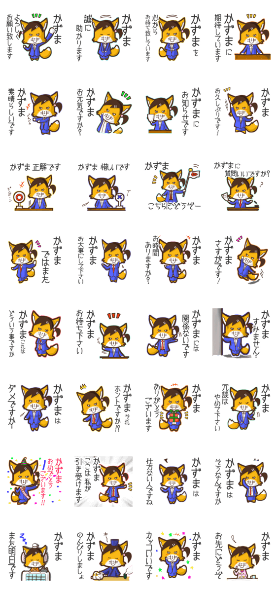 | スタンプ説明 | ゆっけ。が贈る【かずま】に『送る用』名前スタンプ23です。友達とのやりとり等に。《ゆっけ。のアニぱ!》07「きつねのてんくー姉妹・妹くーこ」です。 |