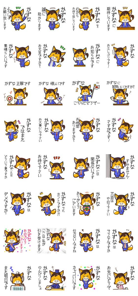| スタンプ説明 | ゆっけ。が贈る【かずな】に『送る用』名前スタンプ23です。友達とのやりとり等に。《ゆっけ。のアニぱ!》07「きつねのてんくー姉妹・妹くーこ」です。 |