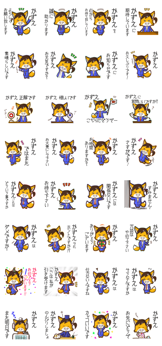 | スタンプ説明 | ゆっけ。が贈る【かずえ】に『送る用』名前スタンプ23です。友達とのやりとり等に。《ゆっけ。のアニぱ!》07「きつねのてんくー姉妹・妹くーこ」です。 |