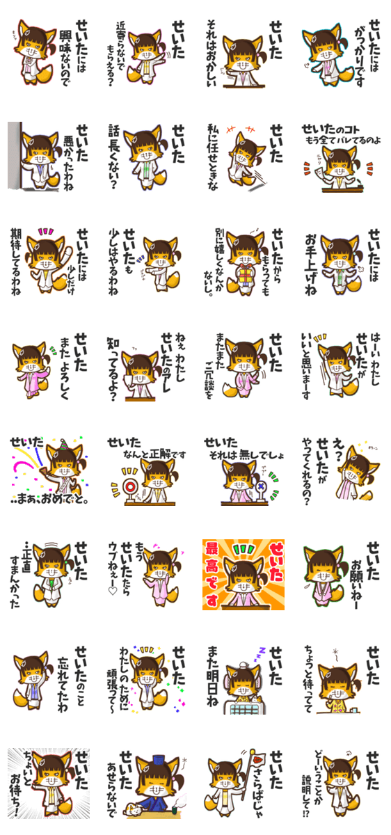 | スタンプ説明 | ゆっけ。が贈る【せいた】に『送る用』名前スタンプ22です。友達とのやりとり等に。《ゆっけ。のアニぱ!》06「きつねのてんくー姉妹・姉てんこ」です。 |