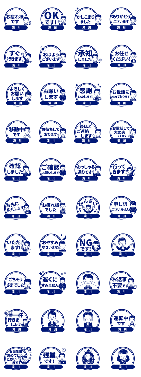 | スタンプ説明 | 滝川/たきがわ様専用!ビジネスマン、サラリーマンの会社仕事にOK!職場、オフィス業務他、大人のマナー丁寧敬語でもOK。印鑑/はんこ/ハンコ/判子/名字/名前入り/スタンプ |
