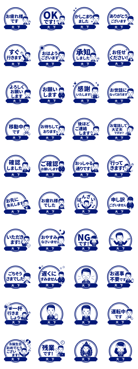 | スタンプ説明 | 大下/おおした様専用!ビジネスマン、サラリーマンの会社仕事にOK!職場、オフィス業務他、大人のマナー丁寧敬語でもOK。印鑑/はんこ/ハンコ/判子/名字/名前入り/スタンプ |