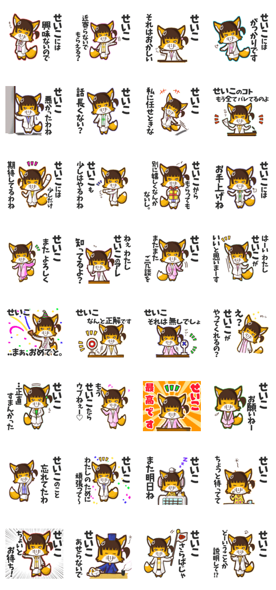 | スタンプ説明 | ゆっけ。が贈る【せいこ】に『送る用』名前スタンプ22です。友達とのやりとり等に。《ゆっけ。のアニぱ!》06「きつねのてんくー姉妹・姉てんこ」です。 |