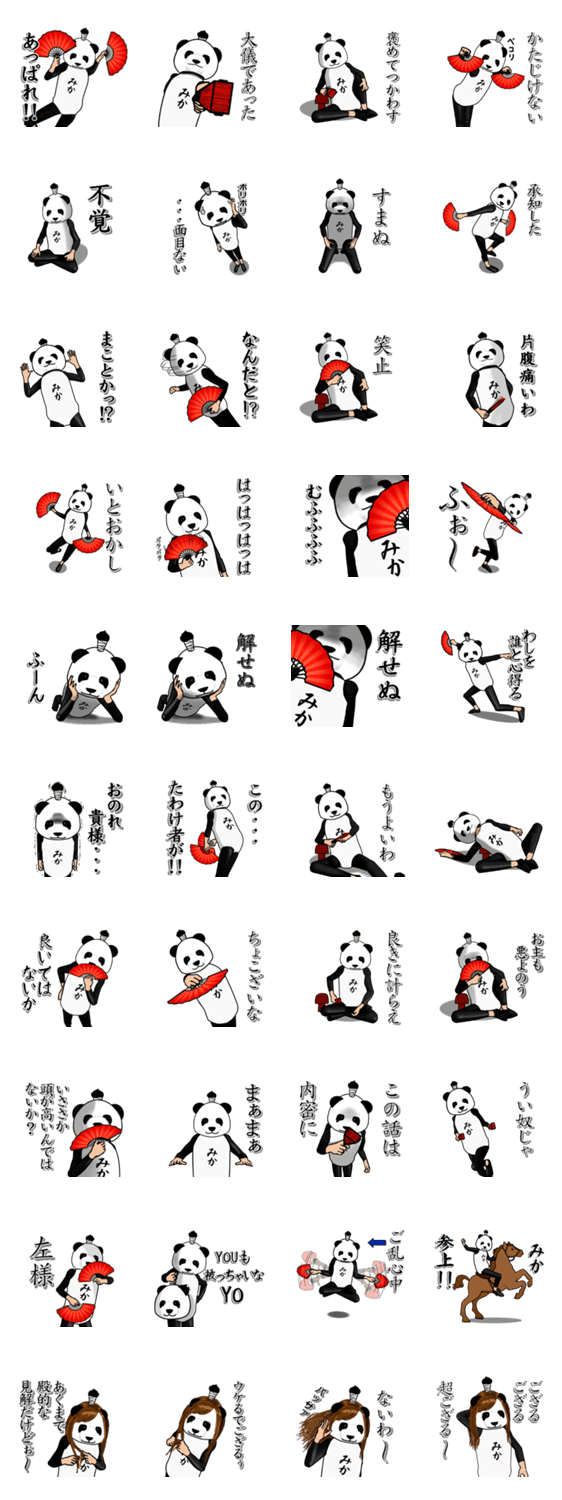 | スタンプ説明 | パンダの着ぐるみ姿の名前・名字スタンプ第4弾。 みか.みかこさん等に。 【みかちゃん】【みかりん】もあるよ |