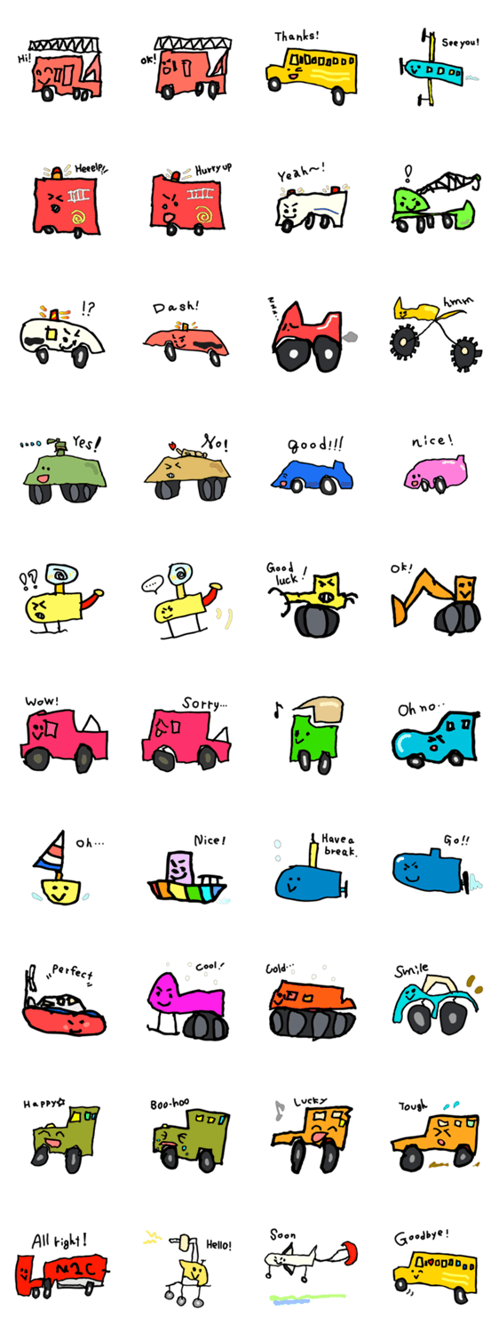 みんなが大好きな乗り物たちが集りました。消防車、パトカー、飛行機、トラック、ブルドーザ、バイク、潜水艦、雪上車、月面車などなど、VEHICLES(ビークルズ)たち。