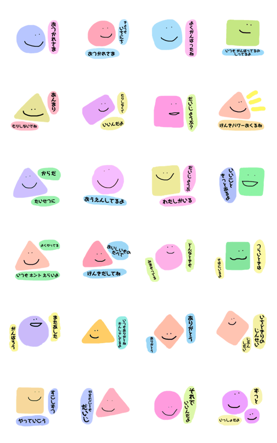 | スタンプ説明 | 優しい言葉、励ましの言葉あつめました。なかなか言えない言葉はパステルカラーの癒し系まるさんかくしかくんに伝えてもらいましょう。 |