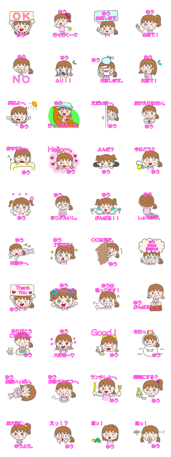 | スタンプ説明 | ゆうさん用の女の子スタンプです。全国の悠、優さん、ぜひ使ってください! |