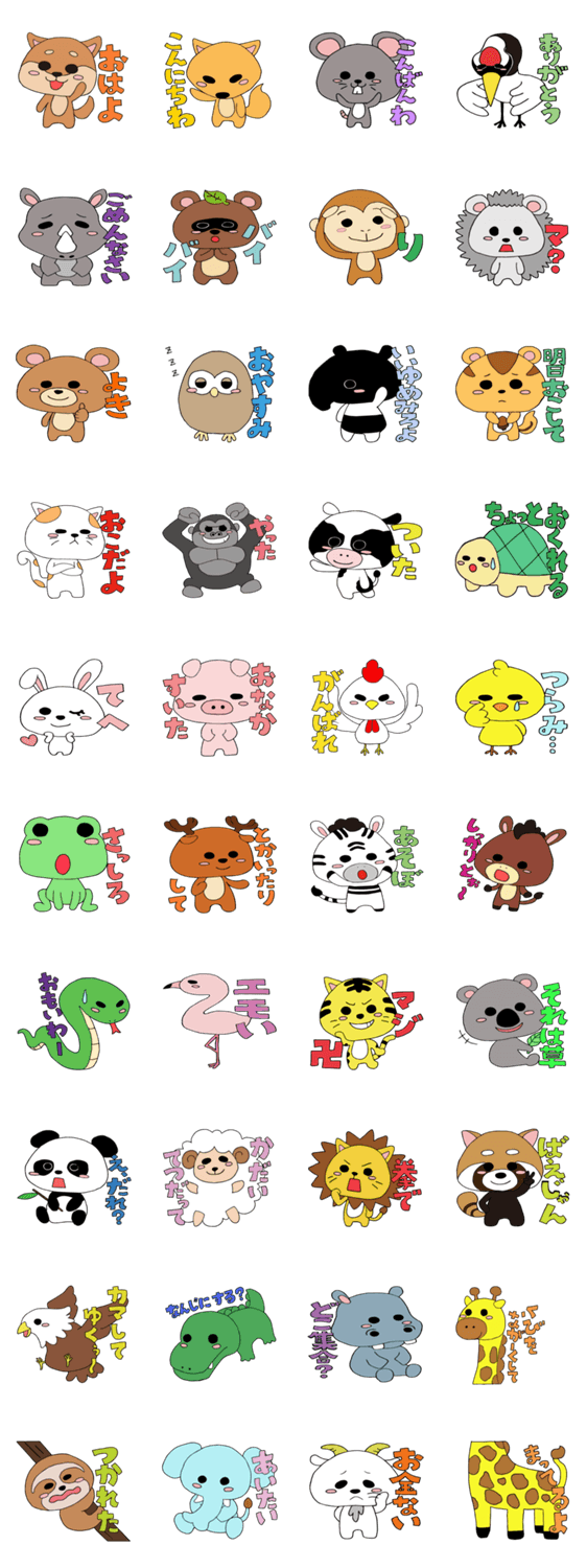 | スタンプ説明 | ゆるいどうぶつたちとでか文字のスタンプです。使いやすいことばになっています。 |