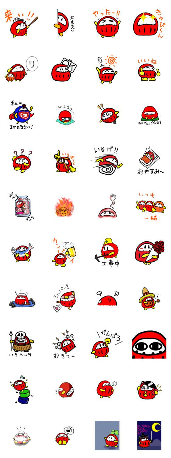 | スタンプ説明 | 劇団だるま座のキャラクター だるまちゃんをスタンプにしました。いろんな表情のだるまちゃんをお楽しみください。 |