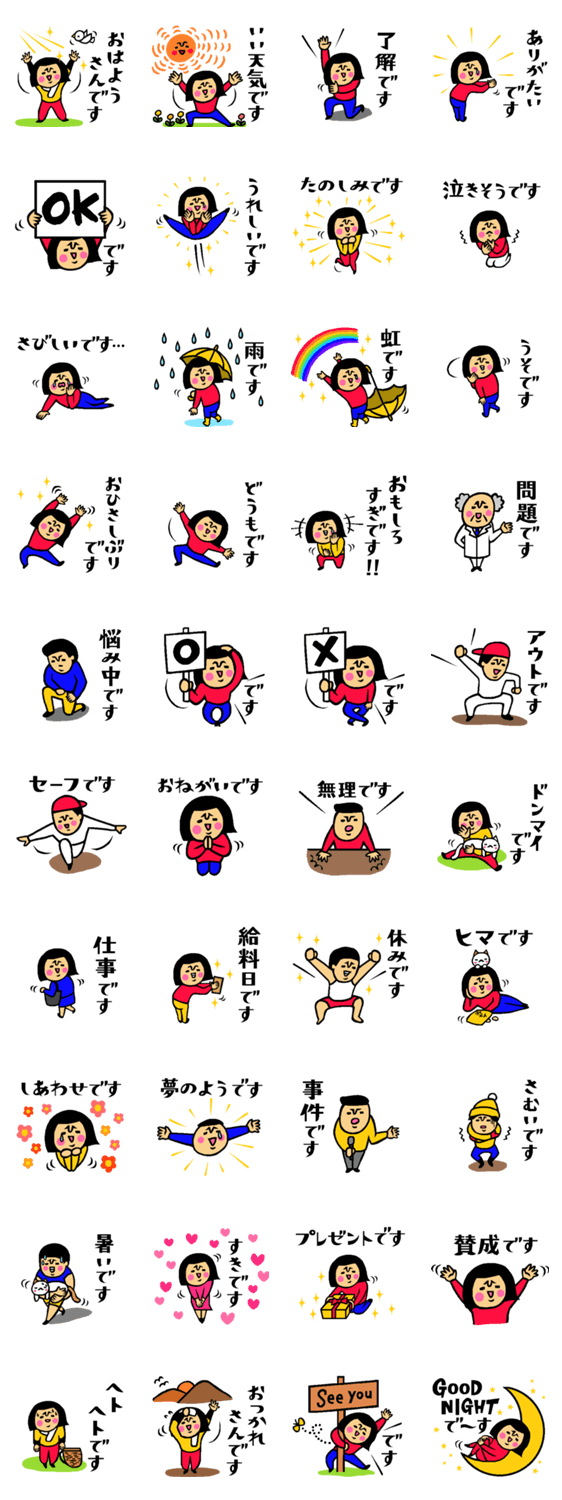 | スタンプ説明 | よく使う挨拶をはじめ、日常で使える言葉に「です」をつけた敬語のスタンプ集です!お友達をはじめ、目上の方とのトークにも役立ちます♪ |