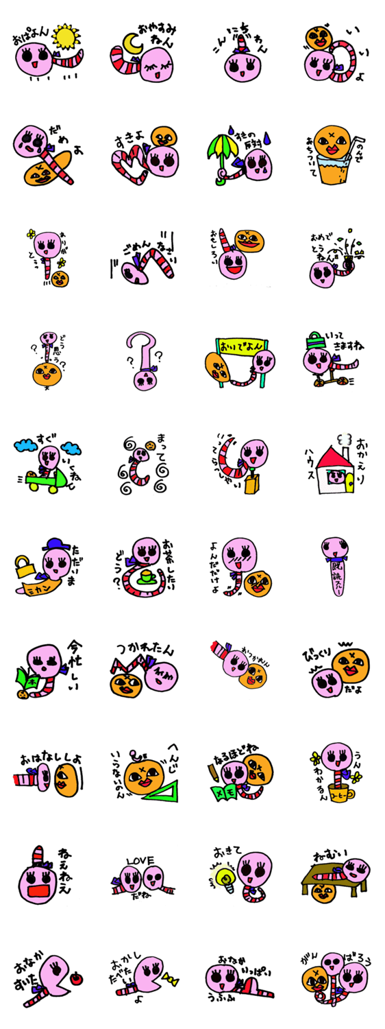 土の中にいるかわいいミミズちゃんと果物のかわいいミカン。そしてその友達のかっこいいミミズくん。彼女らの平和な日常のスタンプです。