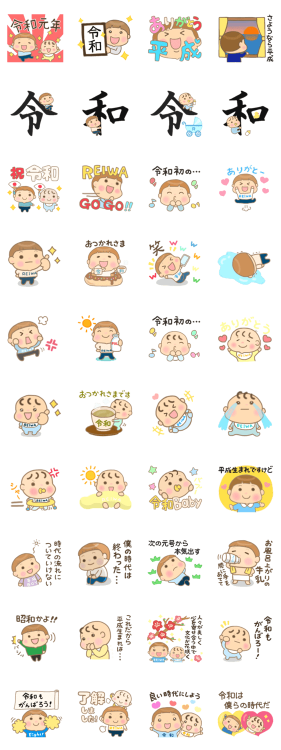 | スタンプ説明 | 新元号 令和を記念した赤ちゃんと幼い男の子の令和スタンプです。日常でも使えるフレーズも沢山入っていて便利です。新しい時代に想いを馳せながらお使いください。 |