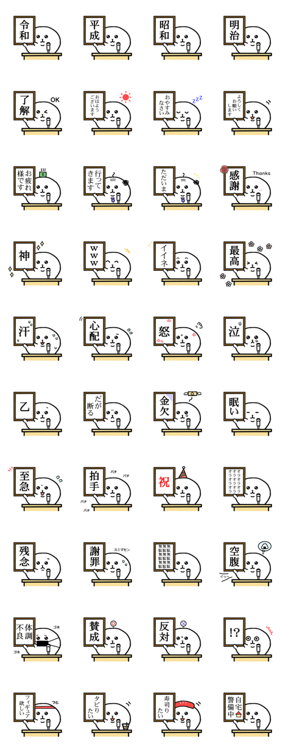 元号発表時のスタンプです。令和、平成、昭和、明治あります。タピオカ飲みたい、寿司食べたいなど現代用語もありますので是非使用してみて下さい。