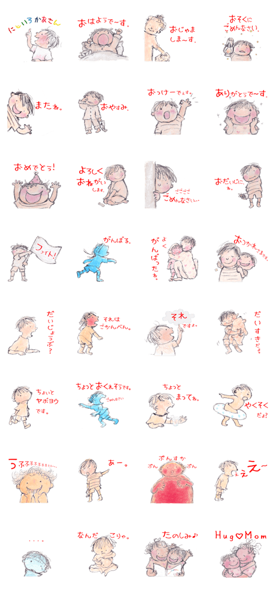 親子のための優しい絵本『にじいろかあさん』の世界から、たっくんたちがスタンプになってあなたの心をお手伝い!よく使う言葉や気持ちの色をほんわり伝えます。