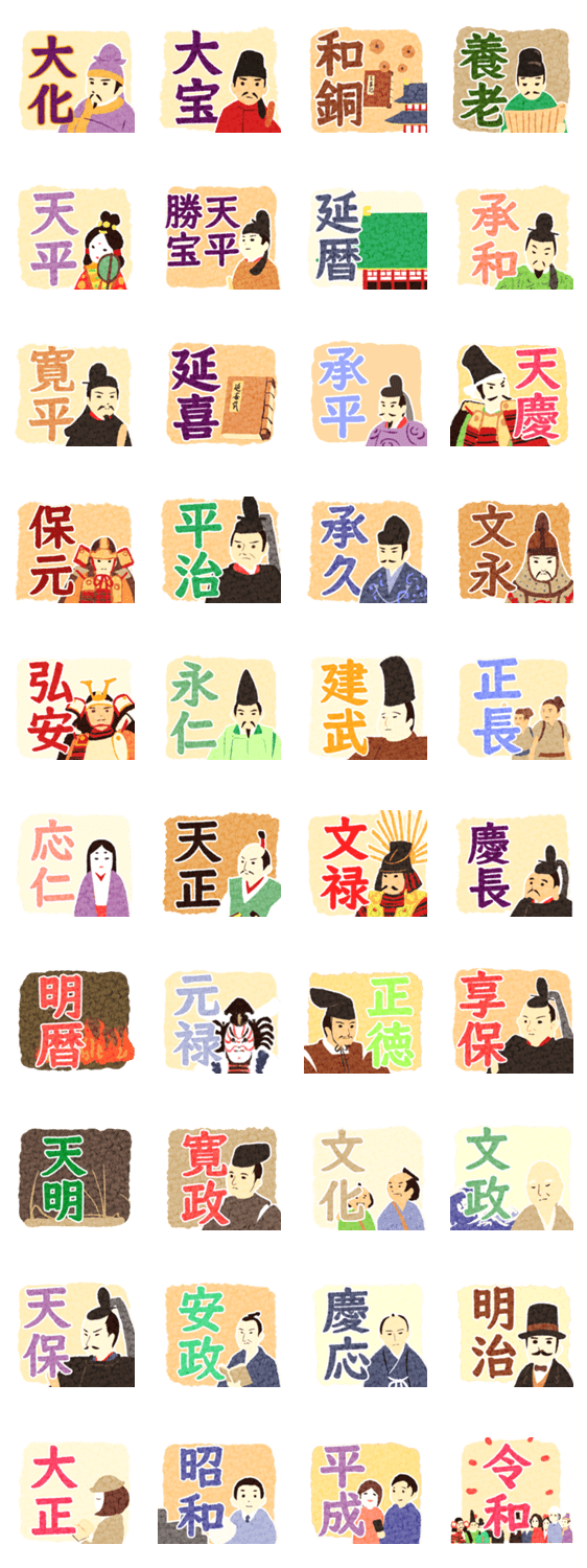 | スタンプ説明 | 新元号を迎えるにあたって、これまでの元号を振り返ってみませんか。 受験やテストによく登場する元号を40個厳選してあるので、勉強にも役立つスタンプです。 |
