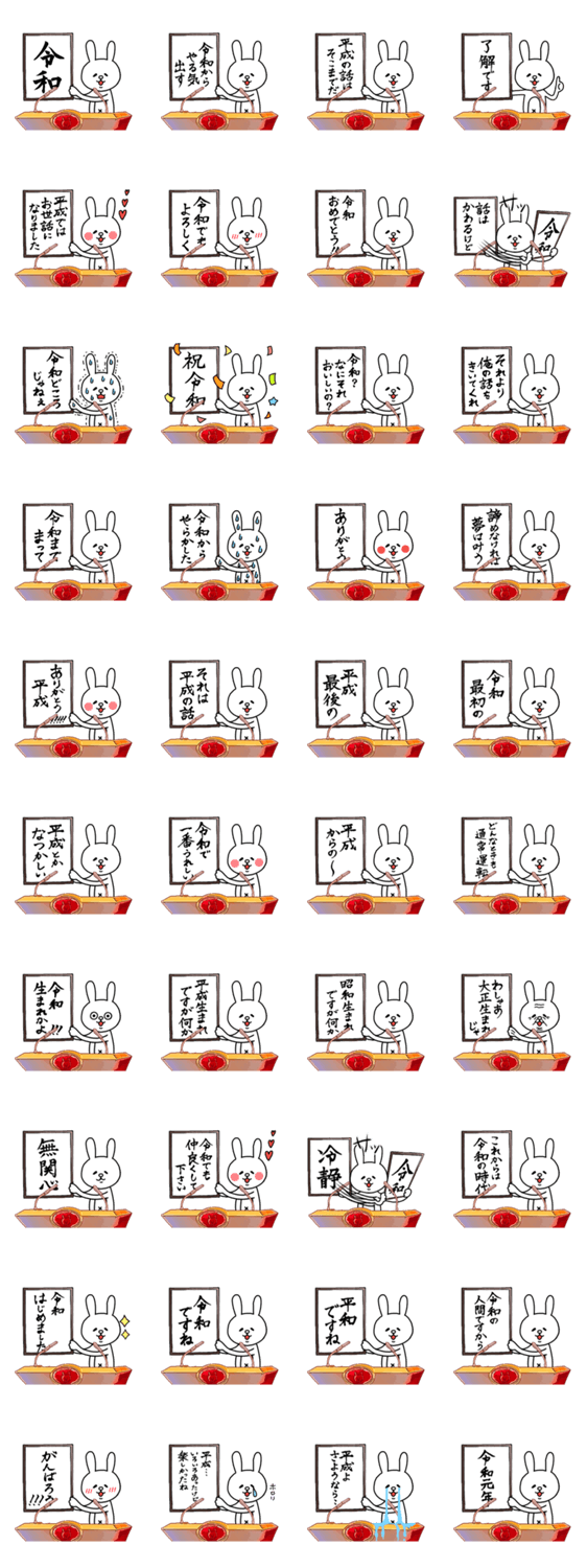 | スタンプ説明 | 新元号(令和)を発表したときのスタンプです。 シュールなうさぎさんが平成と令和について色々ささやいています。 |