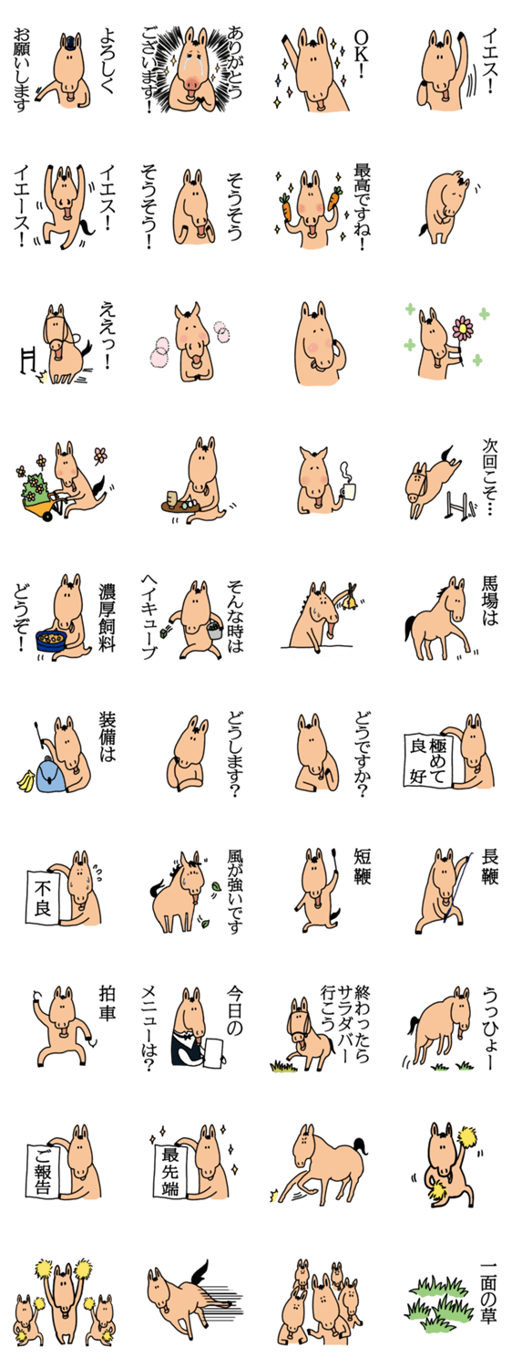 | スタンプ説明 | 乗馬や競馬がお好きな方にオススメの日常生活に使える馬用語入りスタンプです。馬に乗る人もそうでない人も、馬好きさんならきっと乗りこなせます。 |