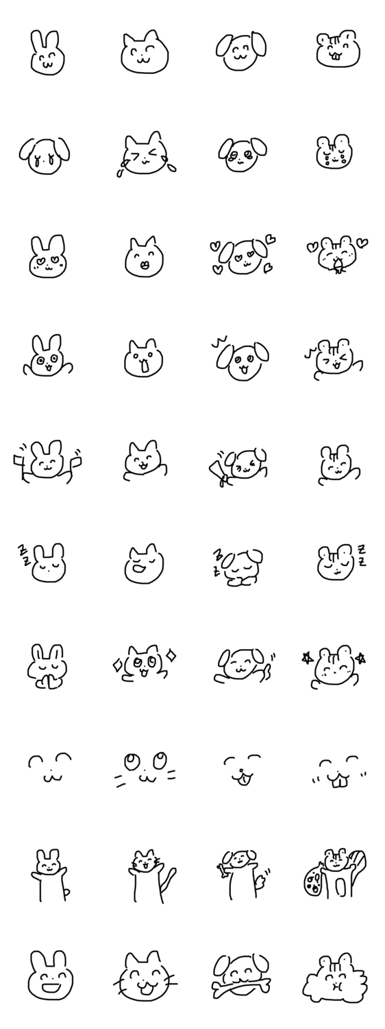 表情豊かな、手書きのどうぶつたち。うさぎ、ねこ、いぬ、りすみたいなどうぶつ。