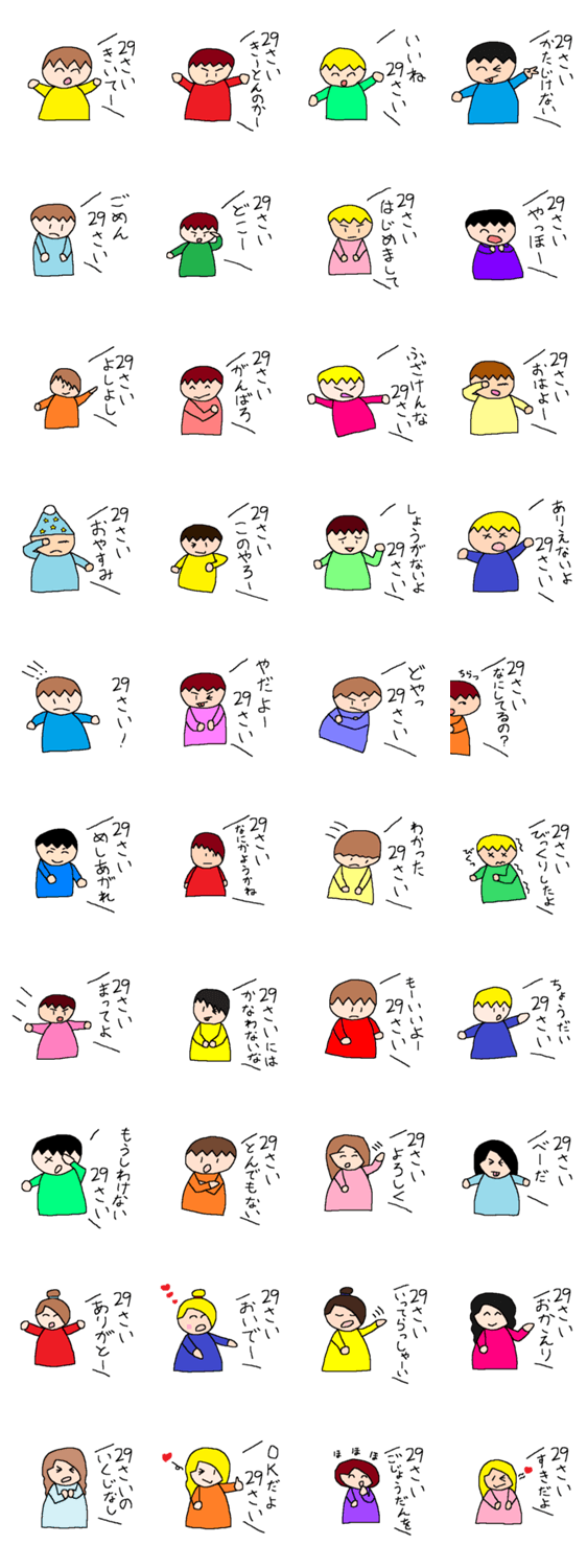 「つばさのえ」シリーズ特別編。【年齢】に送るスタンプです。可愛くて使いやすい言葉を用意しました。29才/二十九歳/社会人/渋谷/原宿/男子/女子のみんなが対象。