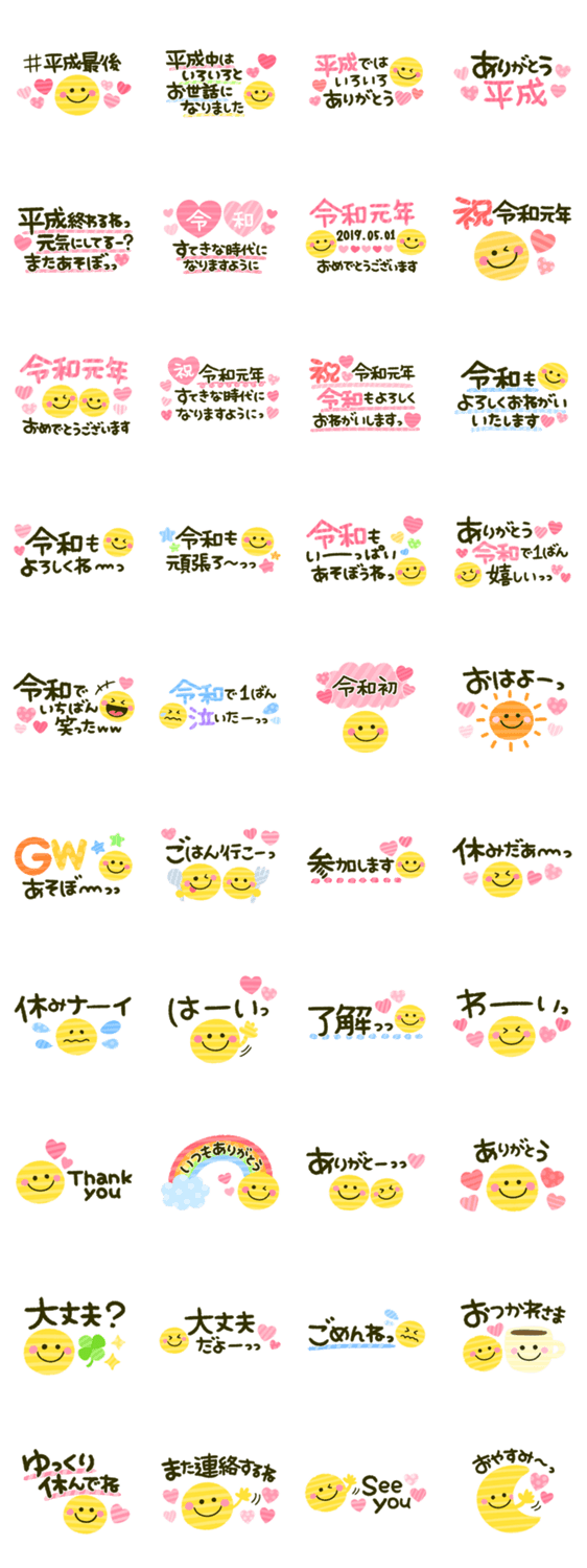 スマイルと可愛いがいっぱい詰まった令和をお祝いするスタンプです♪GWや日常の会話で使える言葉も♪
