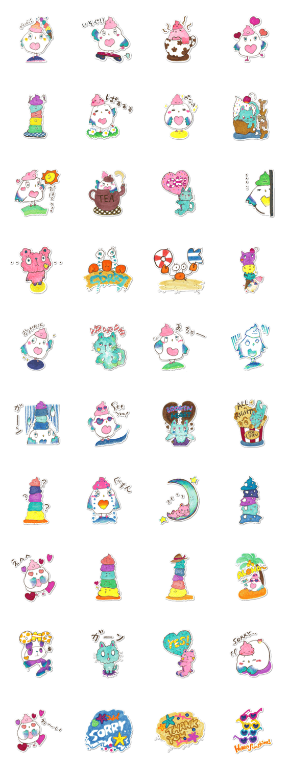 | スタンプ説明 | 甘いもの大好き!ほわほわホイップクリームを頭にのせたトリと仲間たちの手描きスタンプ |