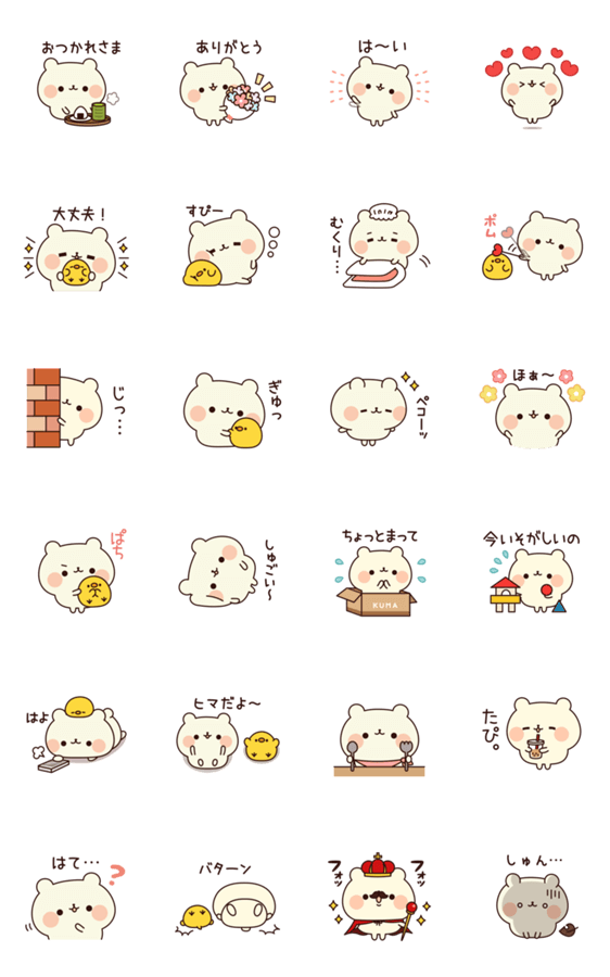 マイペースなシロクマさんとお友達のヒヨコさんのスタンプです♪挨拶やリアクションなど、日常で使いやすいものが入っています!