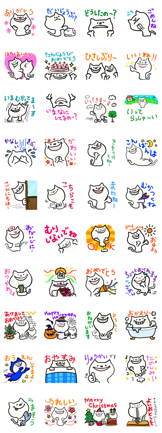 白い猫のキャラクターにゃり〜んの日常で使うあいさつのスタンプです。