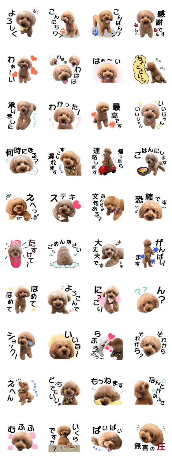 トイプードルの実写版スタンプ。表情豊かなトイプードルを日常会話のスタンプにしました。目にやさしいデカ文字です。