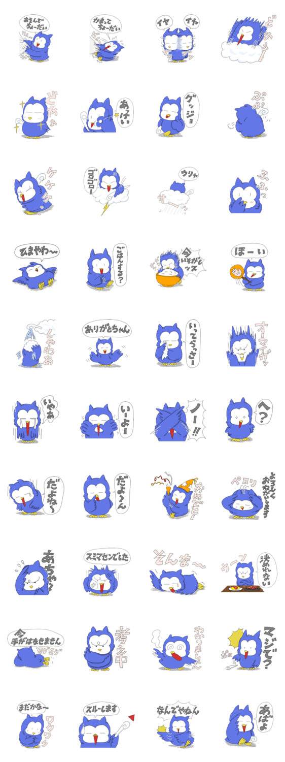 | スタンプ説明 | ぷくどんは手乗りサイズの青いふくろうのコ。自力で飛べないため仙人の杖で雲に乗ることができる。小憎らしい「ぷくどん」スタンプ第2弾。 |