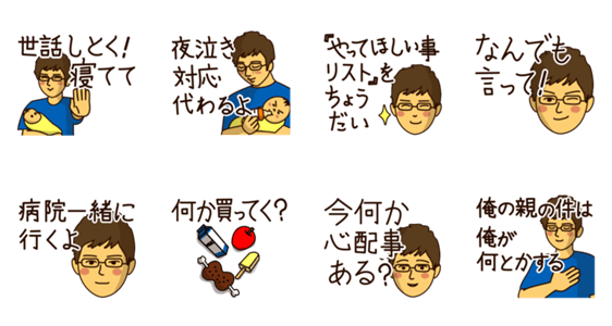 | スタンプ説明 | 妊娠・出産など長いマタニティ期および産褥期を支えるパパの為に作りました。これで産後クライシス知らずに。 |