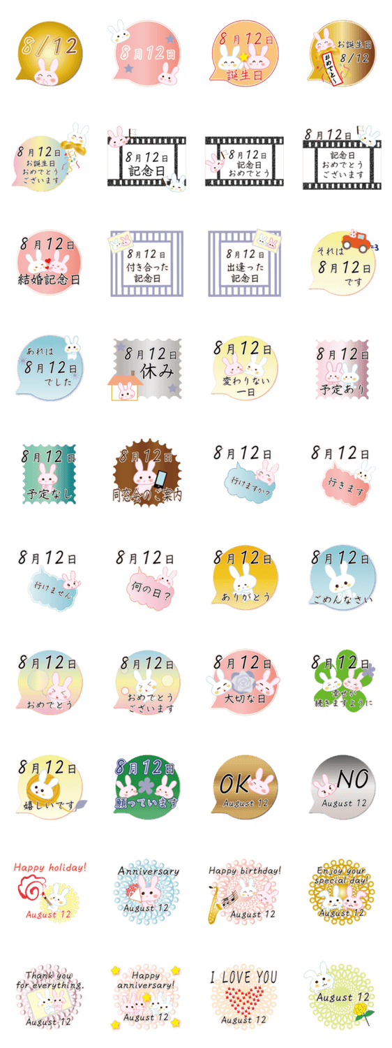 8月12日が記念日や誕生日の方に送るうさぎ。記念日を忘れないために所有。同窓会のご案内や日常に。恋人、夫婦、家族、友達など好きな方に送る好きウサギ応援隊シリーズ。