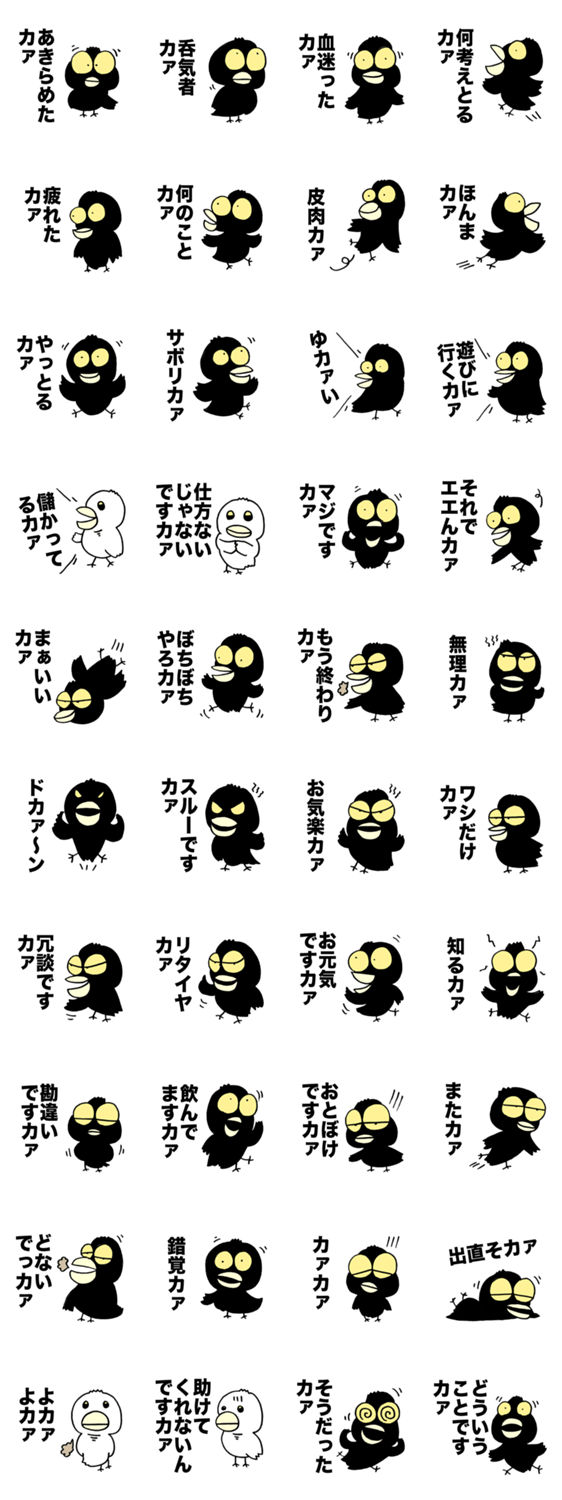 語尾に「カァ」とつけて話すカラスのスタンプ。幸せの白いカラスも登場。